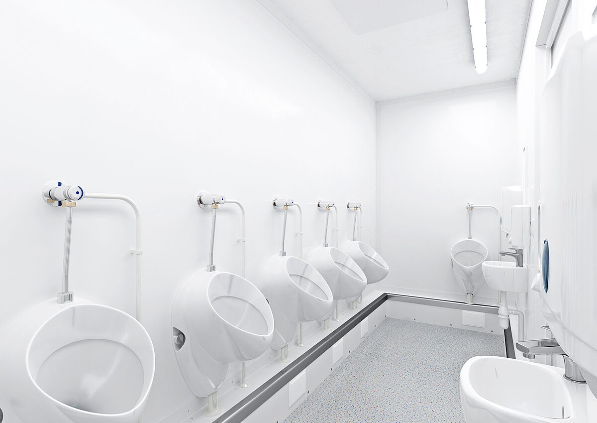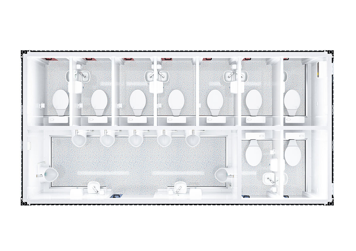 Nine toilets and seven urinals in one container – made possible thanks to optimum space utilization. One side of the container, fitted with urinals and two toilets, is dedicated to men, while the other side houses seven toilets for ladies.