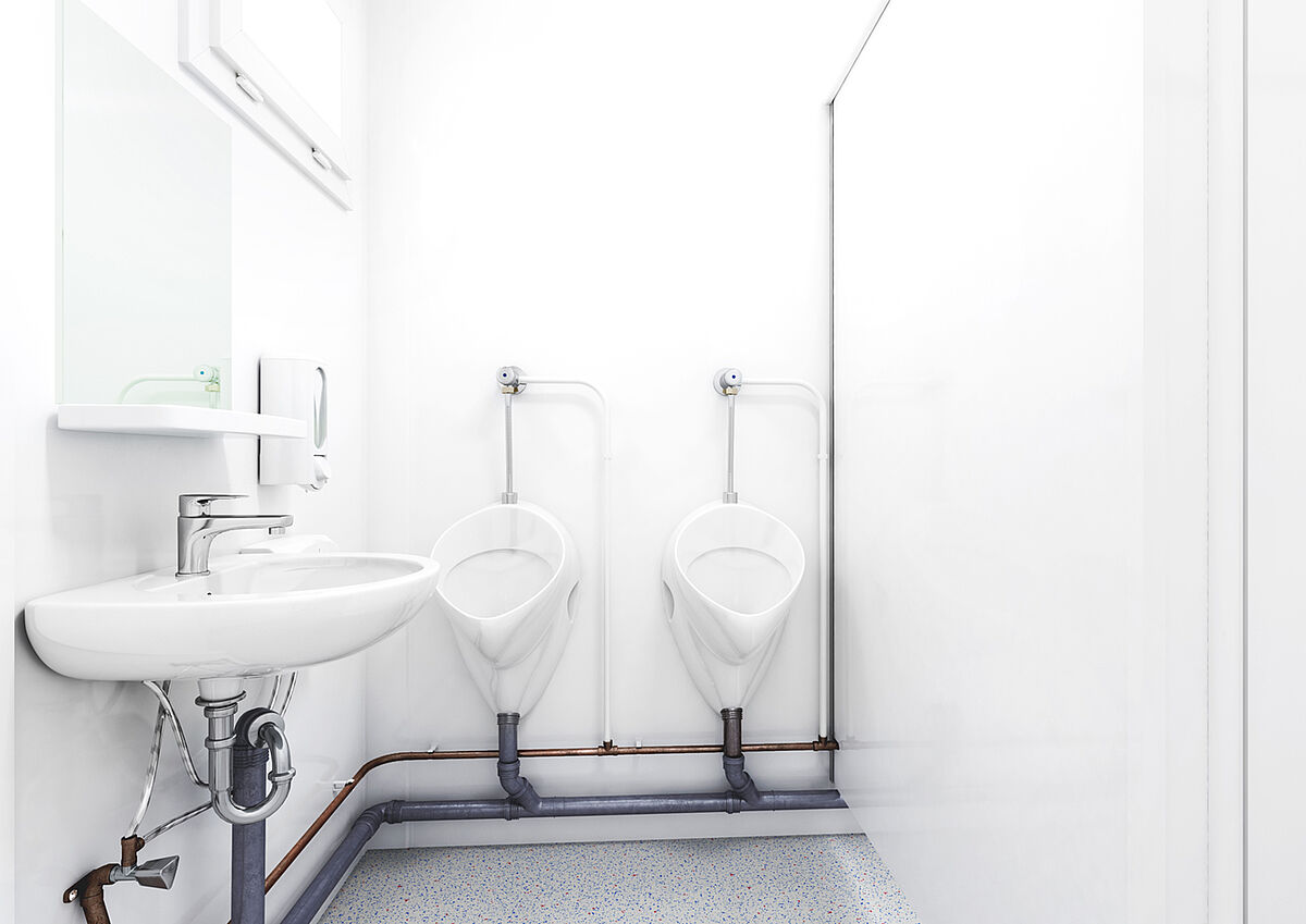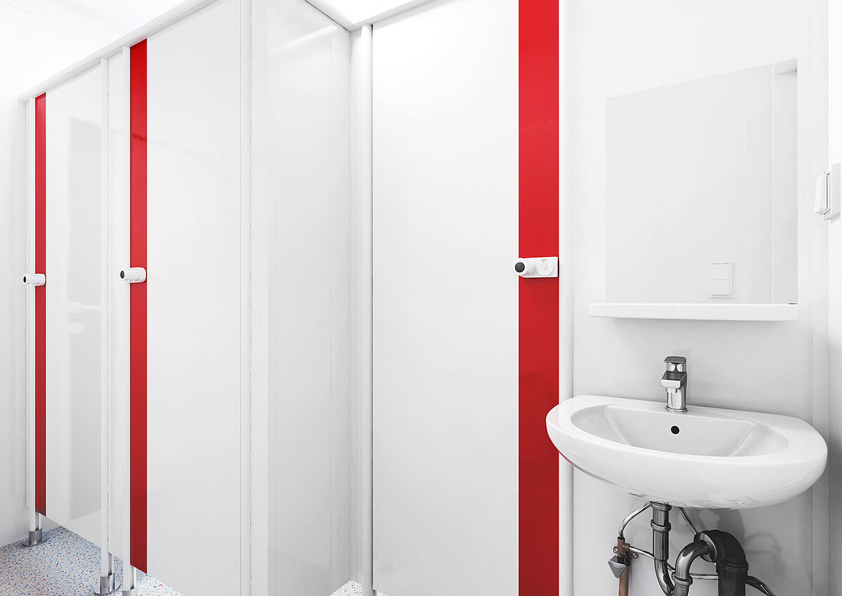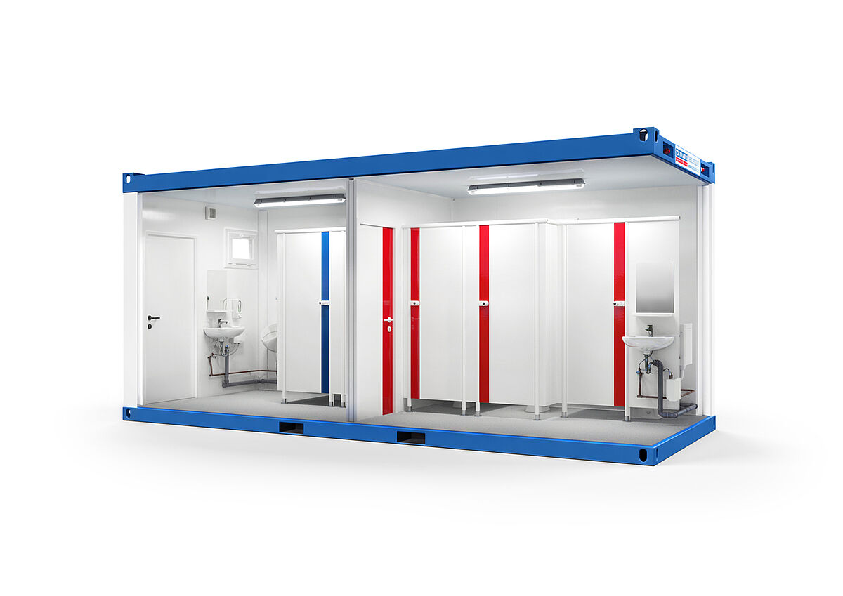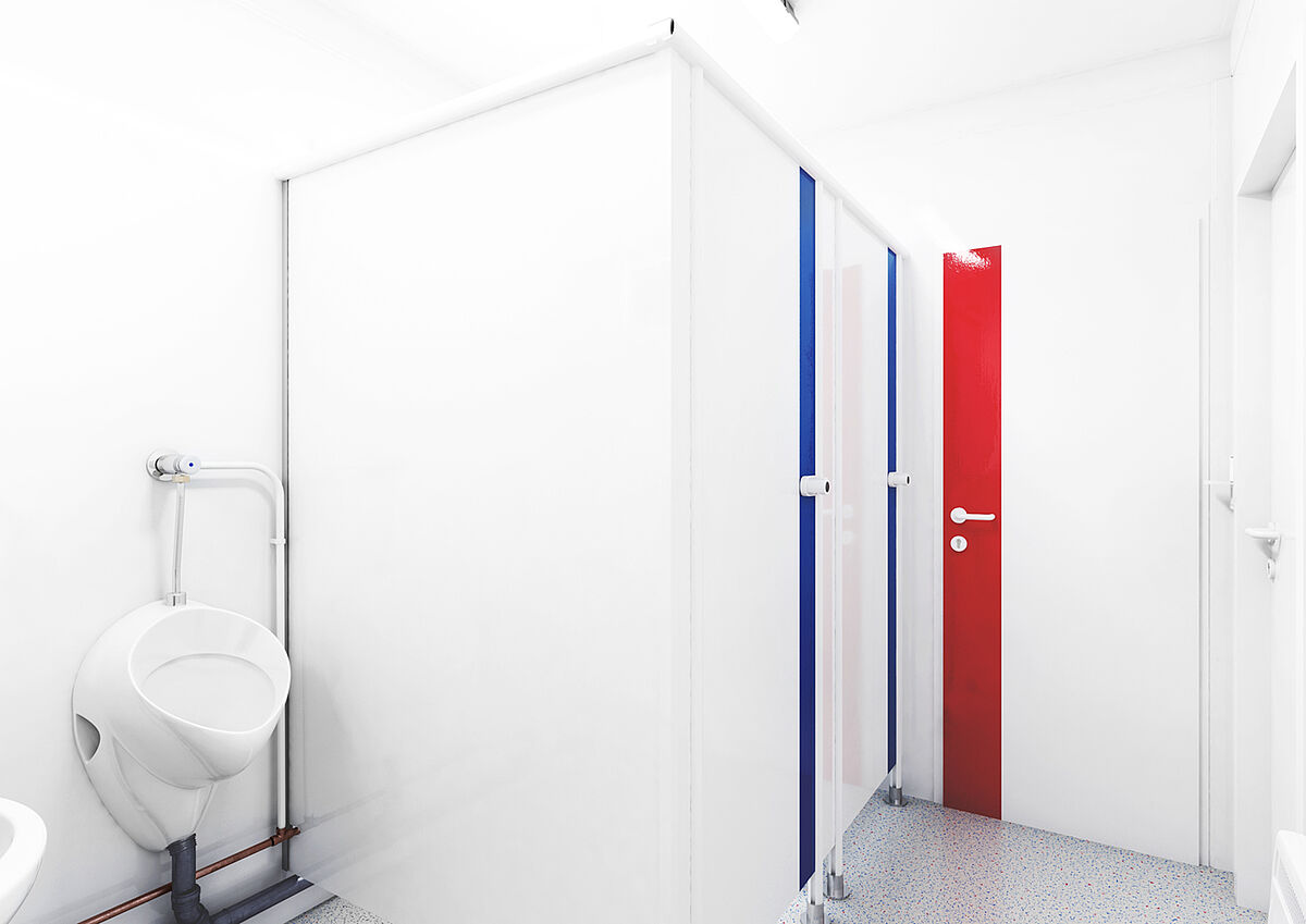 The interiors of these 20-ft containers boast an impressively high level of functionality and a comparatively spacious layout. The women’s area, for example, includes three lockable toilets and an entrance area with wash basin, soap dispenser, towel dispenser, and heater. The men’s area includes two separate toilets, two urinals, a wash basin, and a radiator. Thanks to the fact that they are spatially segregated, both areas can be used at the same time.