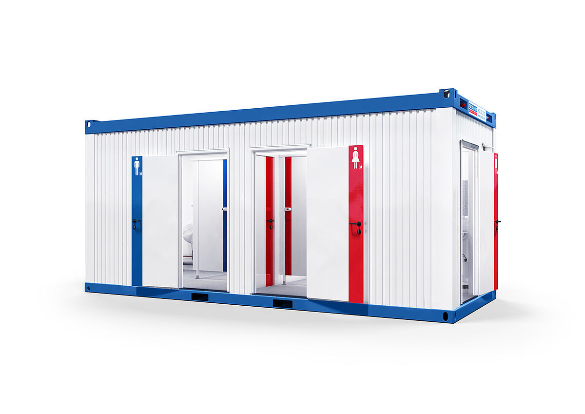 Featuring no fewer than four exterior doors, Construction Line W/M sanitary containers Flexi are highly versatile in terms of function and positioning. For maximum privacy, these containers feature two toilet areas, one for women and one for men, each with their own entrance.