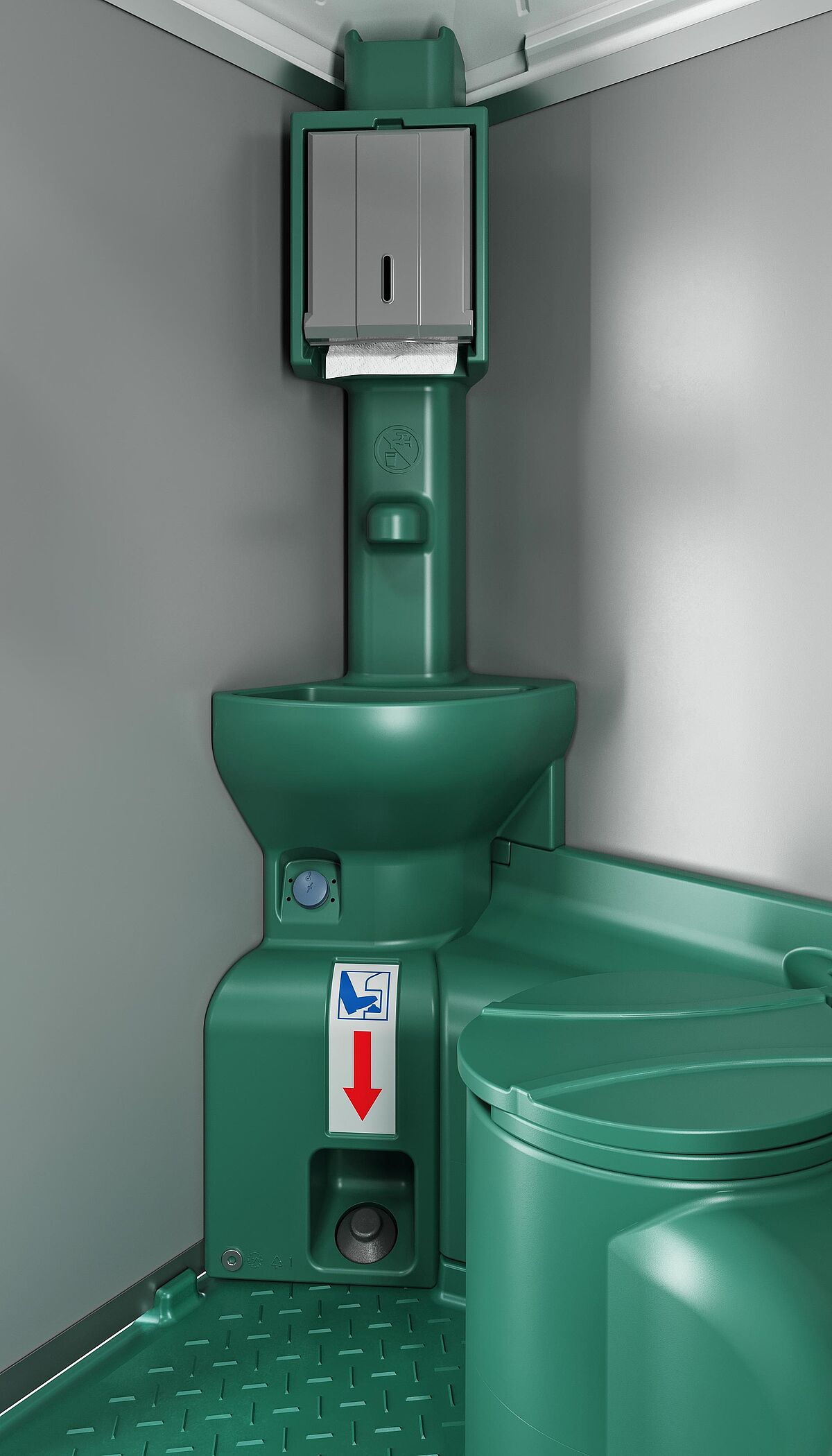 The new DIXI® GREEN combines sustainability with the highest standards of hygiene. With a hand wash basin including a 35 l fresh water tank, the paper towel dispenser and the soap dispenser, it creates the conditions for hand hygiene on the construction site, at events or during harvesting. The entire forearm can be washed in the large hand wash basins: DIXI® GREEN can be used wherever mobile toilet cabins are needed.