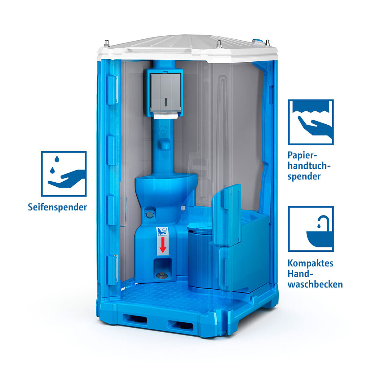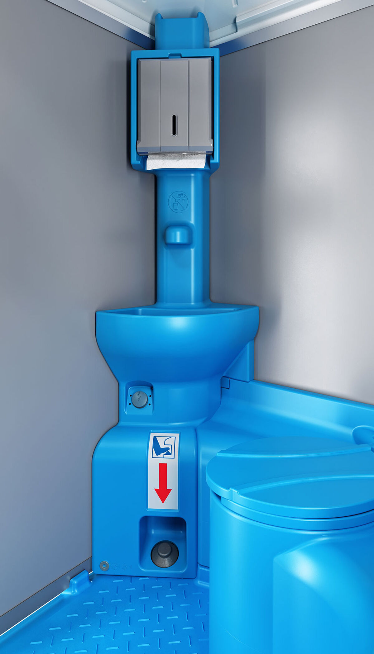 In addition to the proven plus points of the DIXI® PLUS, the DIXI® PLUS WASH offers a wash column with a hand wash basin incl. 35l fresh water tank as well as paper towel dispenser and soap dispenser. The entire forearm can be cleaned in the large hand wash basin, another plus for additional hygiene. With the DIXI® PLUS WASH, you can easily raise the standard of hygiene on your construction site and always provide an opportunity to wash your hands. The DIXI® PLUS WASH can be used anywhere and is convincing on construction sites, at public events and private events. The most important plus points: