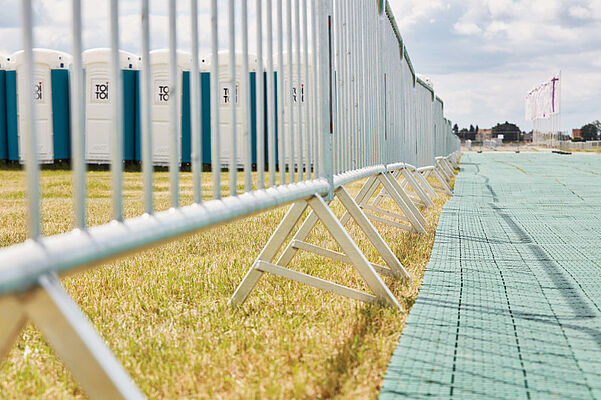 Trucks are only allowed to enter the event site via designated routes? The premises need to be secured? No drama for our project managers. TOI TOI & DIXI provides you with the right equipment, such as guidance systems, entrance and exit sluices, ramps, barriers, fences with privacy screens, and floor plates, suitable for heavy goods traffic.